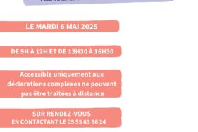 Une permanence des impôts aura lieu le mardi 6 mai prochain dans les nouveaux locaux du C.C.A.S à côté de la mairie, Rue de l’Hermitage, dans le cadre de la campagne déclarative impôt sur le revenu 2025.